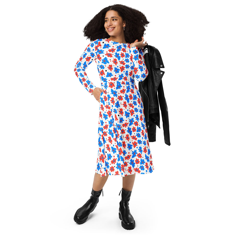 Blue-RedFloral - All-over print long sleeve midi dress